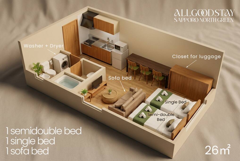 【Room Features】 ・Fully private 1R apartment (26㎡) located on the 1st floor – Easy-to-access ground floor unit ✨ ・Accommodates up to 4 guests – Max: 4 guests – Best suited for up to 3 guests for comfort 1 single bed, 1 semidouble bed, 1 sofa bed ・Bright, clean space with comfortable beds and linens ・Large TV with Netflix, YouTube, and Prime Video access(no local TV) ・High-speed Wi-Fi / Kitchen with microwave available ⸻ 🛏 Private Room (26㎡) – Entire Unit • 1F unit, ideal for up to 4 guests (best for 3 or fewer) • Beds: 1 single, 1 semi-double, 1 sofa bed • Bright & clean space with comfy bedding • Large smart TV with Netflix, YouTube, Prime Video • Fast Wi‑Fi, kitchen & microwave 📍 Prime Location • 4‑min walk to Kita‑18‑jo Station (Namboku Line) • Quick direct access: Sapporo Sta (2 min), Odori (4 min), Susukino (6 min) • 6 min walk to Hokkaido Univ & Hospital • Convenience stores, supermarket & eateries within 5 min 🌟 Nearby Attractions & Ski Access • Sapporo Beer Garden – 10 min by car (20 min by transit) • Odori Park & Sapporo TV Tower – 6 min • Clock Tower – 8 min • Hokkaido Shrine & Maruyama Zoo – ~20 min by car • Ski resorts: Kokusai & Teine (55 min), Kiroro (1 h 5 min), Rusutsu (1 h 25 min), Niseko Hirafu (1 h 50 min), Furano (2 h) 🕒 Check‑in/out • Check‑in: from 16:00 (early requests possible) • Check‑out: by 11:00 🧴 Amenities Shampoo, conditioner, body soap, toothbrush, hand soap, slippers Kitchen essentials, microwave, fridge, mailbox ✅ Booking Info Fully licensed under Japan’s Hotel Business Law Guest names required; passport copy for non‑Japanese guests Calendar always up-to-date Enjoy a clean, comfortable stay and ideal Sapporo location—we look forward to hosting you!