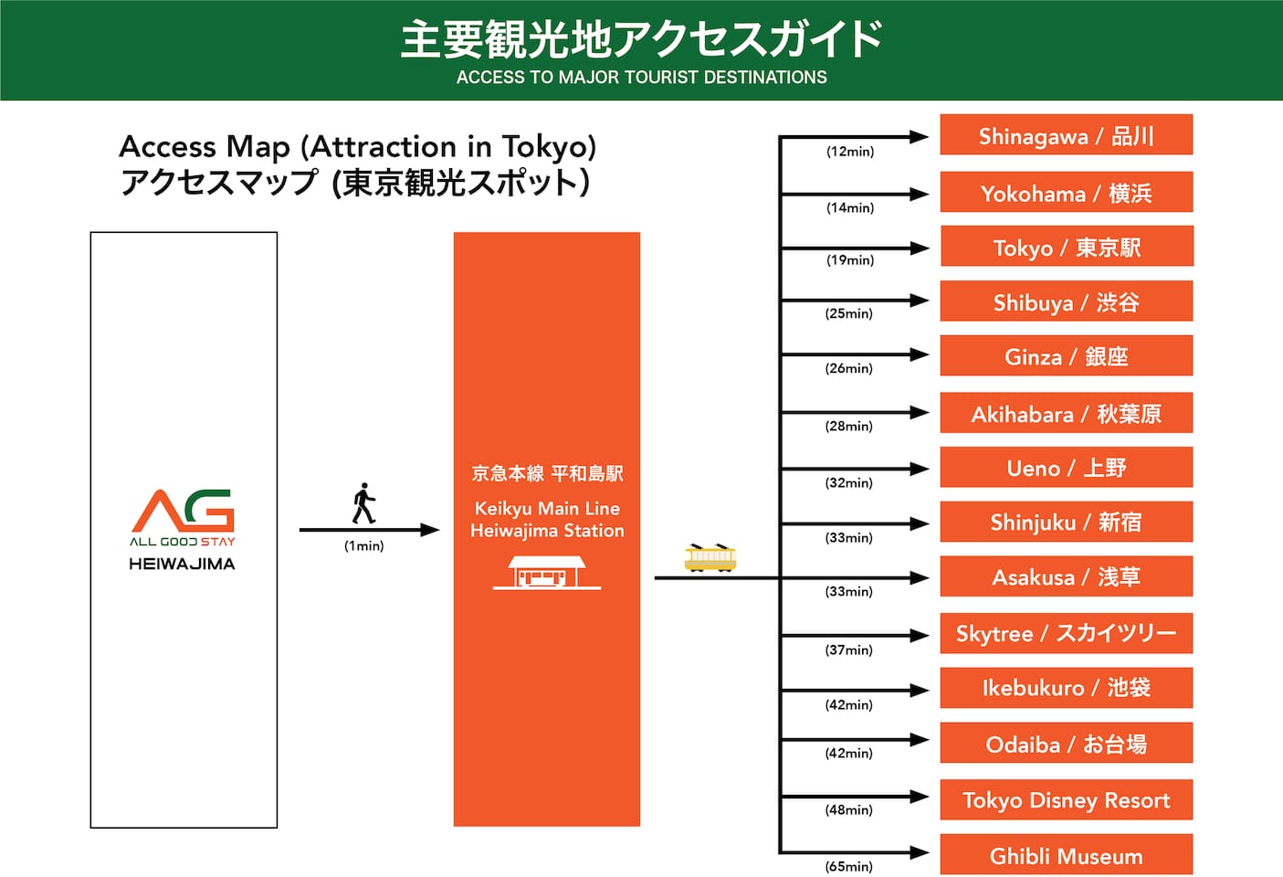 【Room Features】 Private studio for up to 2 guests,2 single beds,Bright, clean space with hotel-style bedding TV with Netflix, YouTube, Prime Video(no japanese channels) High-speed Wi-Fi, kitchen, microwave Parcel drop box for longer stays 【Great Access】 1 min walk to Heiwajima Station (Keikyu Line) 10 min by train / 15 min by taxi to Haneda Airport (~¥2,100) 120 min to Narita Airport via direct train Shinagawa 6min, Tokyo 19min, Shibuya 23min, Shinjuku 31min, Yokohama 14min Disney Resort: 48min by train or 60min by bus (from Kamata) 【Nearby Spots】 Supermarkets, drugstores: 1 min walk FamilyMart, 7-Eleven: 2–3 min walk Many restaurants (ramen, soba, curry, burgers, gyudon, etc.) Big Fun Heiwajima and Heiwajima Onsen also nearby 【Check-in / Check-out】 Check-in: From 16:00 (early check-in available upon request) Check-out: Until 11:00 Luggage lockers available at Heiwajima Station(30sec walk) 【Amenities】 Shampoo, conditioner, body soap, toothbrush Hand soap, slippers Kitchen tools, microwave, refrigerator Parcel box, mailbox *No elevator (stairs only) 【Reservation Info】 Calendar is always up to date Licensed under Japanese Hotel Business Law All guest names required Passport copy required for non-Japanese nationals 【Lastly】 We’re committed to providing a clean, safe, and comfortable stay. Enjoy your time in Tokyo with great access and a cozy space. Looking forward to welcoming you!