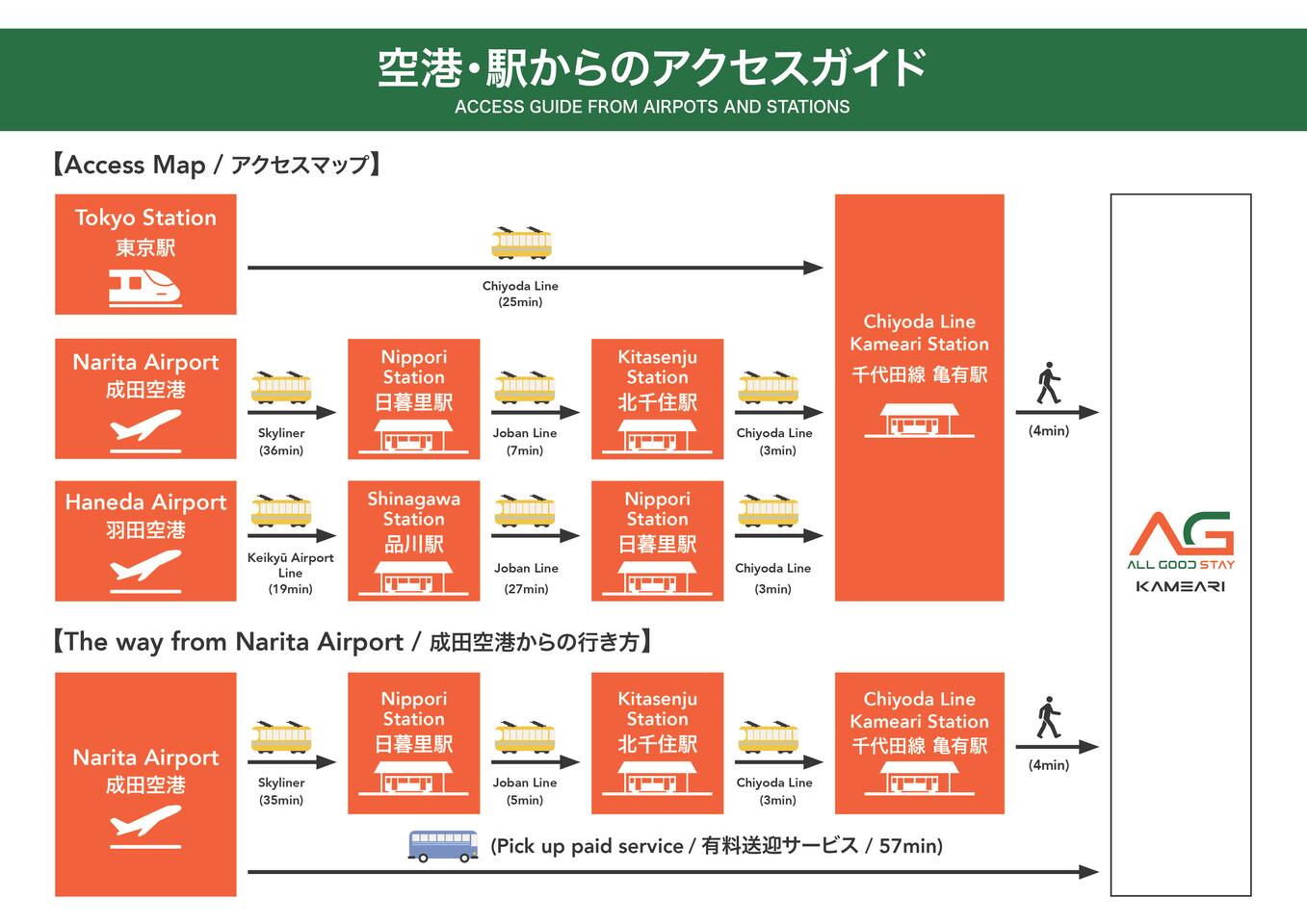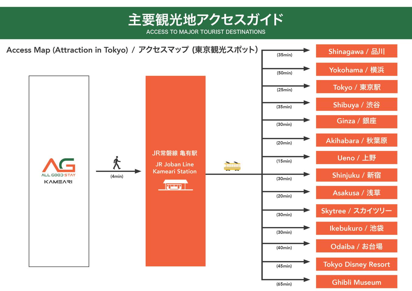 🚉 Easy Access to Tokyo’s Major Areas Kameari Station offers great connectivity via the JR Joban Line and Chiyoda Line. ・Ueno Station:Approx. 15min(JR Joban Line・Chiyoda Line) ・Akihabara Station:Approx. 20min(JR Joban Line) ・Asakusa Station:Approx. 20min(Tsukuba Express Line) ・Tokyo Station:Approx. 25min(JR Joban Line+Tokyo Metro) ・Shinjuku Station:Approx. 30min(JR Chuo・Sobu Line) ⸻ Airport Access ・Haneda Airport:Approx. 60min(Direct Limousine Bus/¥1,200) ・Narita Airport:13min to Aoto Sta.(by train)+32min to Narita(Keisei Skyliner)