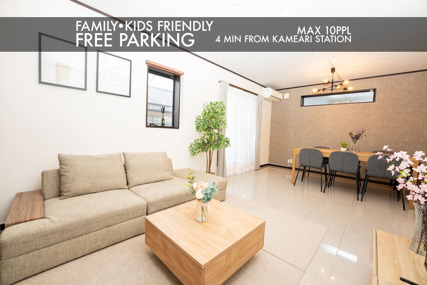 🏡 Welcome to Kameari, Tokyo – A Safe, Spacious & Accessible Neighborhood All Good Stay KAMEARI is located in Kameari, Katsushika Ward, one of Tokyo’s most comfortable and family-friendly neighborhoods. This quiet and safe area offers excellent access to Tokyo’s top attractions while providing the local charm of a traditional Tokyo suburb. ⸻ 🚉 Excellent Access to Major Destinations •Ueno – 15 min by train •Asakusa – 20 min •Akihabara – 20 min •Tokyo Station – 25 min •Shinjuku – 30 min •Tokyo Disneyland – 45 min •Haneda Airport – 60 min by direct limousine bus •Narita Airport – ~45 min by train This location is perfect for travelers who want to explore Tokyo but avoid crowded tourist hubs. ⸻ 🛍️ Everything You Need Within Walking Distance •Convenience store (7-Eleven) – 2 min walk •Supermarket (Ito Yokado) – 5 min walk •Shopping mall (Ario Kameari) – 12 min walk •Restaurants, cafes, ramen shops, izakaya – 5 min radius •Kameari Park & Katori Shrine – 2–6 min walk •KochiKame anime landmarks – Great for sightseeing fans! ⸻ 👪 Perfect for Families, Groups & Remote Workers •Up to 10 guests in a 3-bedroom private house •2 dedicated workspaces with fast Wi-Fi •Free parking on-site •Quiet and peaceful residential area – ideal for longer stays •Washer, dryer, full kitchen, and streaming TV (Netflix, YouTube, Prime Video) Whether you’re coming as a family, a group of friends, or on a business trip, Kameari is a strategic and peaceful base for your stay in Tokyo. ⸻